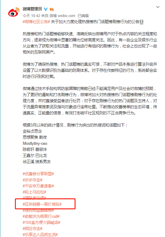 微博处理“区块链第一高价域名”等词条热门话题榜刷榜行为