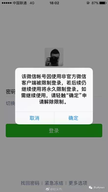 腾讯给出的封号理由为:该微信账号因使用非官方微信客户端被限制登录,若后续仍继续使用将永久限制登录。