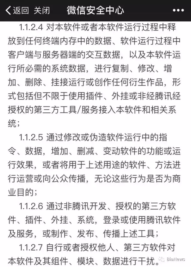 此外,微信个人帐号使用规范也有关于第三方软件的说明,一经发现用户使用第三方软件或插件,腾讯有权对前述行为进行独立判断,并对相关违规帐号进行处理。