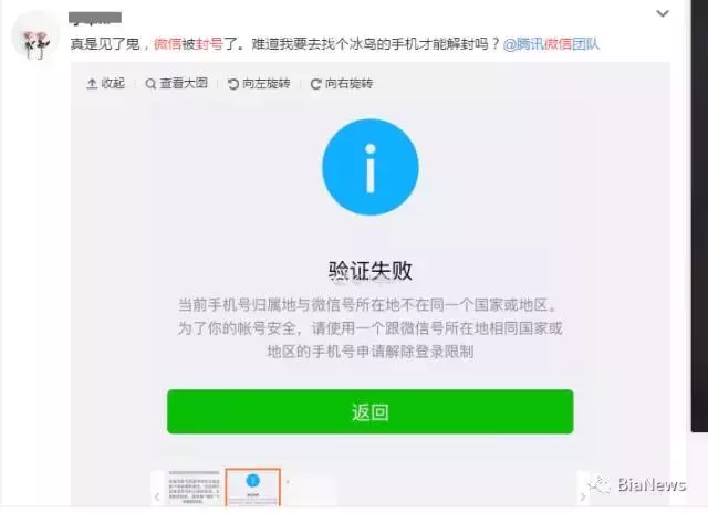 该用户微信归属地填的冰岛,其解绑失败的理由为,当前手机号与微信号所在地不在同一国家或地区。