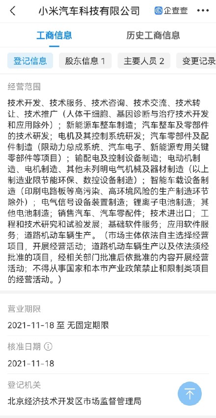 小米成立第二家汽车公司,注册资本10亿元人民币