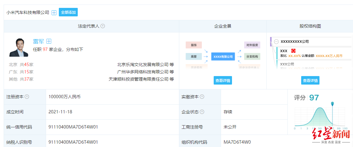 这是小米成立的第二家汽车公司,由小米科技有限责任公司全资控股,注册地址仍在北京市海淀区,位于今年9月1日注册的小米汽车有限公司同一栋楼,雷军间接持有这家公司77.8%的股权。