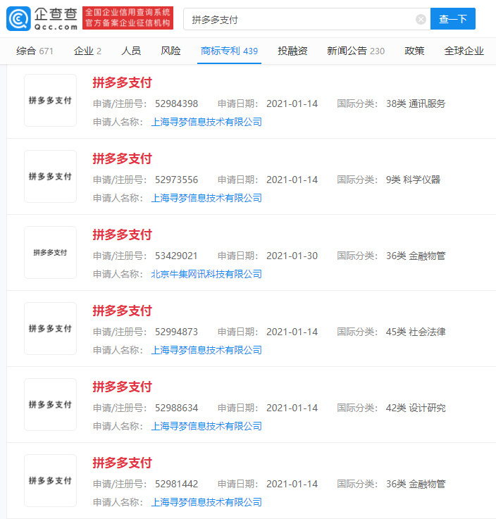 企查查App显示,“拼多多支付”商标国际分类涉办公用品、科学仪器等,最早申请日期为2021年1月14日。