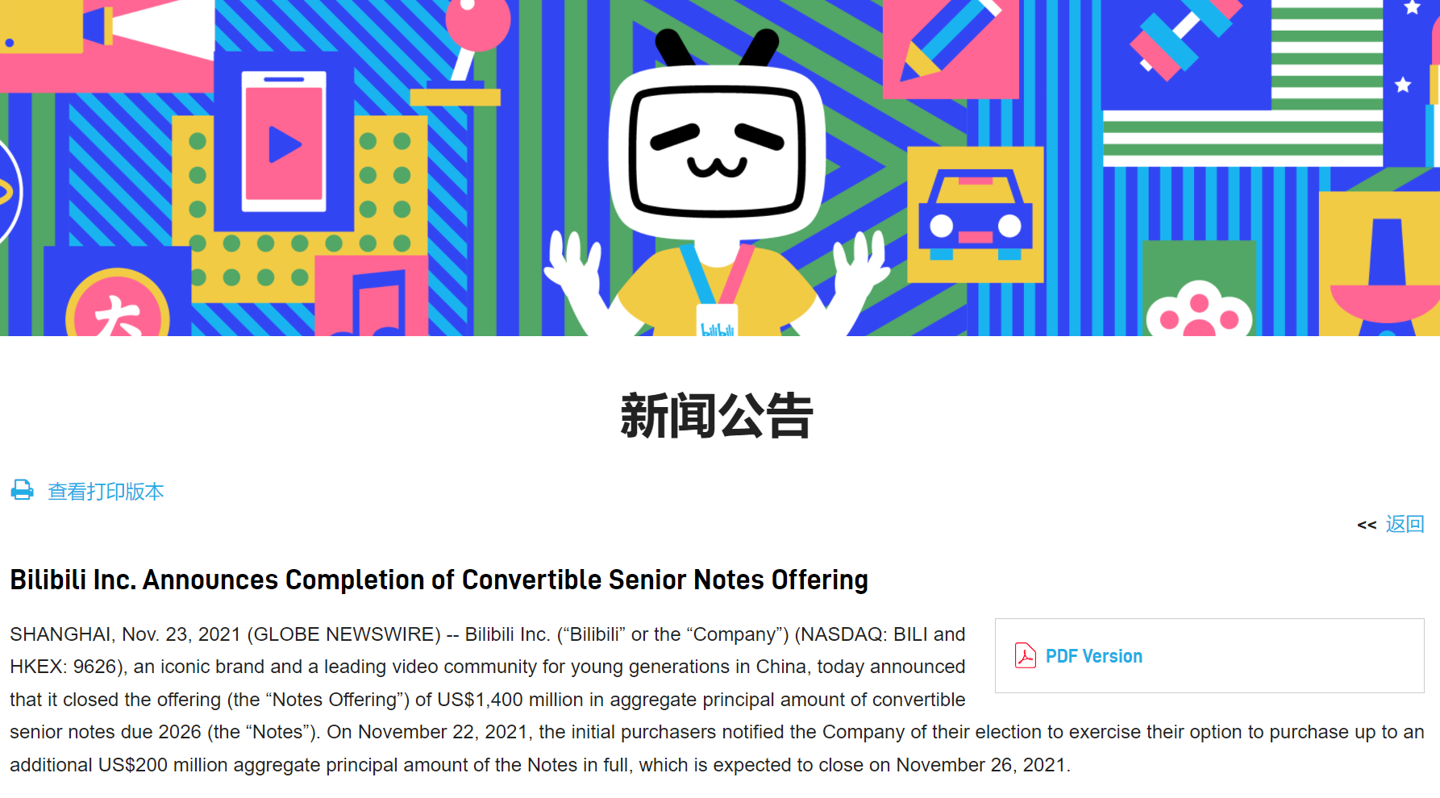 B站宣布完成 14 亿美元可转债发行,额外 2 亿美元绿鞋将被执行