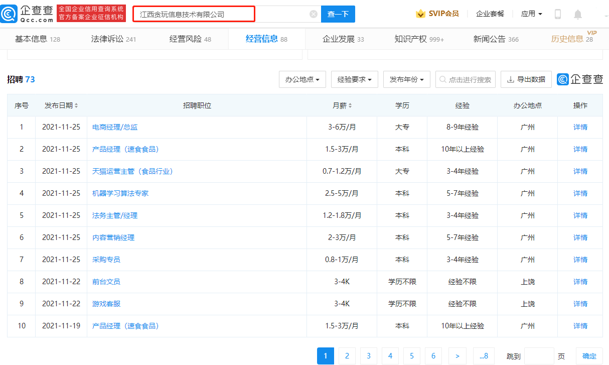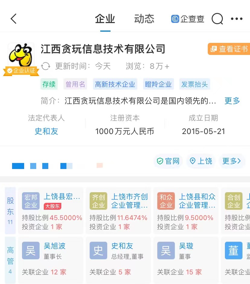 贪玩游戏公司主体为江西贪玩信息技术有限公司,成立于2015年,总部位于江西上饶,是国内领先的集研发、营运与推广为一体的互联网企业。不过,企查查APP显示,江西贪玩信息技术有限公司及其关联公司,目前仍在发布招聘信息,招聘职位包括游戏推广、游戏客服等。