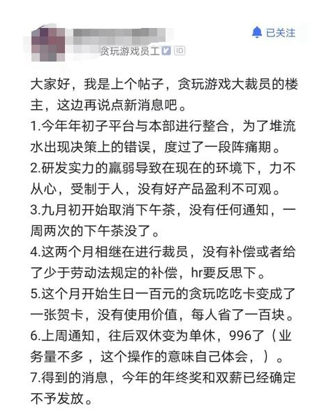 鞭牛士 11月26日消息,据红星资本局报道,近日,在职场社交平台,有贪玩游戏(《原始传奇》《龙腾传世》 《贪玩蓝月》发行方)员工爆料称该公司在大规模裁员,“九月份开始取消了下午茶,没有任何通知,这两个月陆续在裁员,今年的年终奖和双薪已经确定不予发放。”并称未来一段时间还会发放降薪公告。