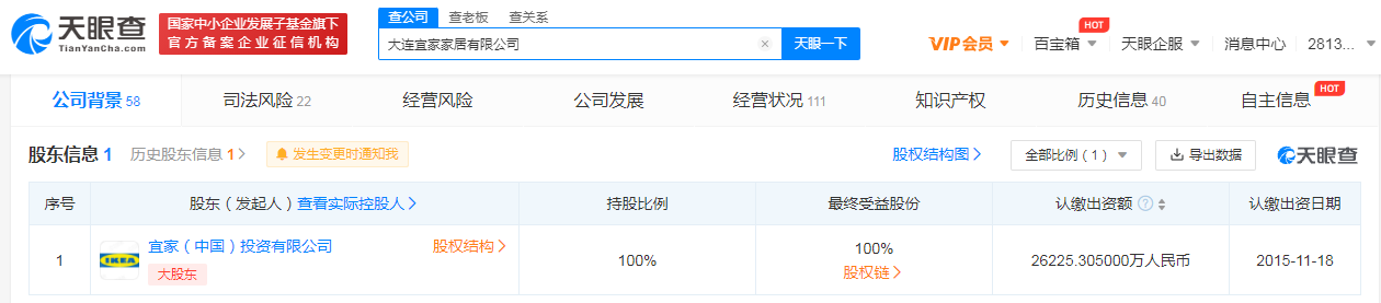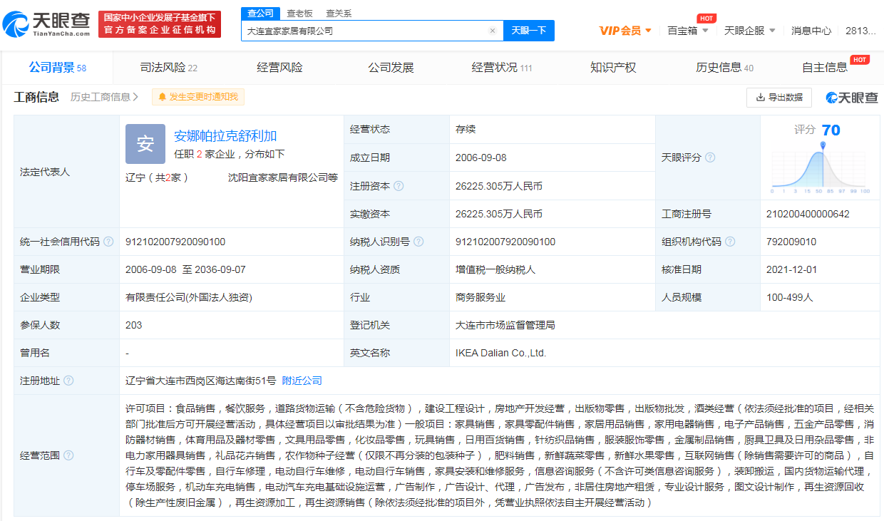该公司成立于2006年9月,法定代表人为安娜帕拉克舒利加,注册资本2.62亿人民币,由宜家(中国)投资有限公司全资持股。