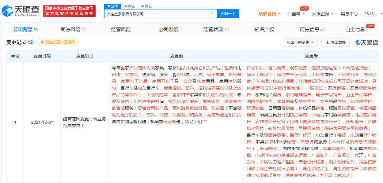 鞭牛士 12月2日消息,天眼查App显示,近日,大连宜家家居有限公司发生工商变更,公司经营范围新增房地产开发经营、新鲜蔬菜水果零售、机动车充电销售、电动汽车充电基础设施运营等。