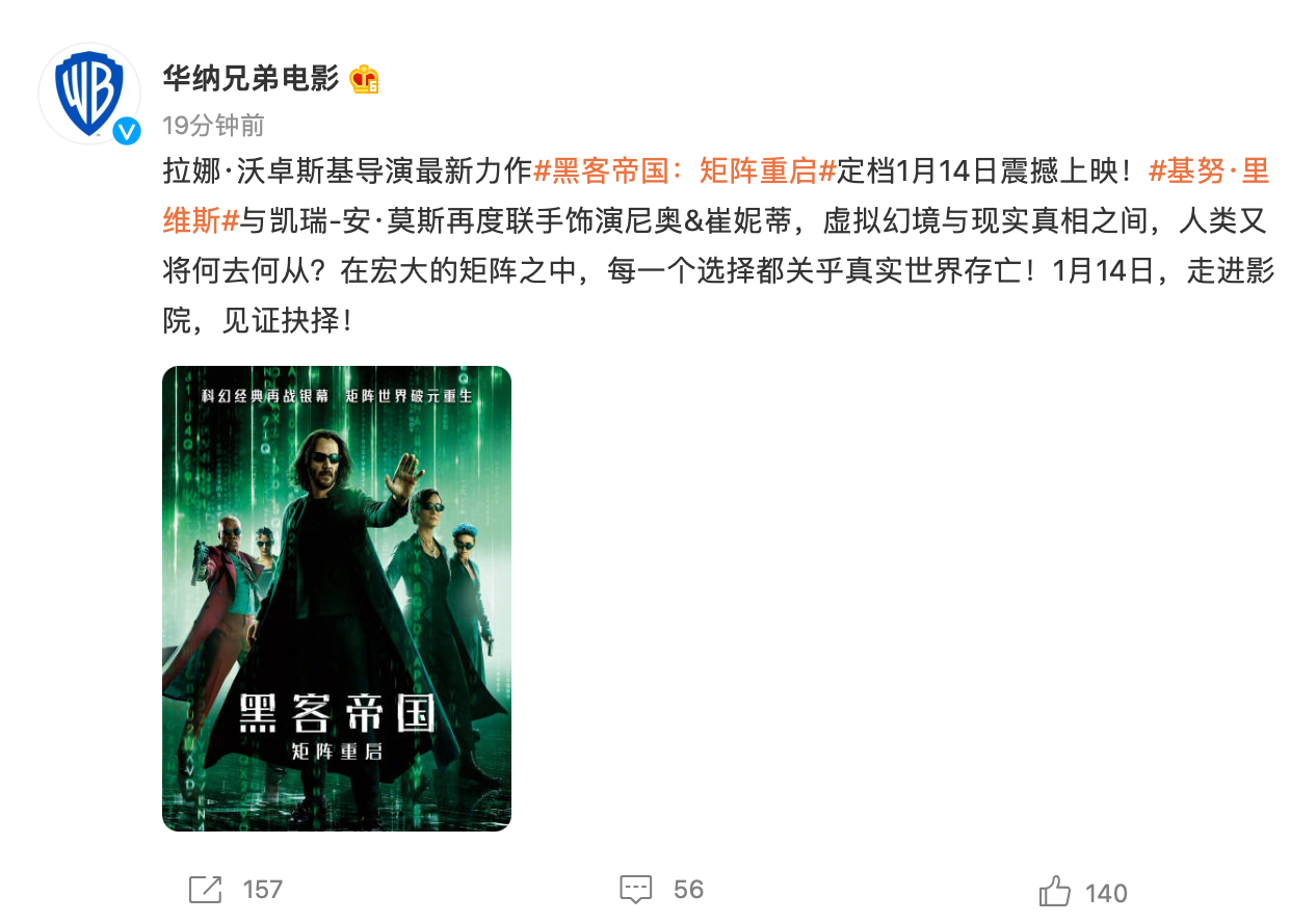 《黑客帝国 4》中国内地定档 2022 年 1 月 14 日