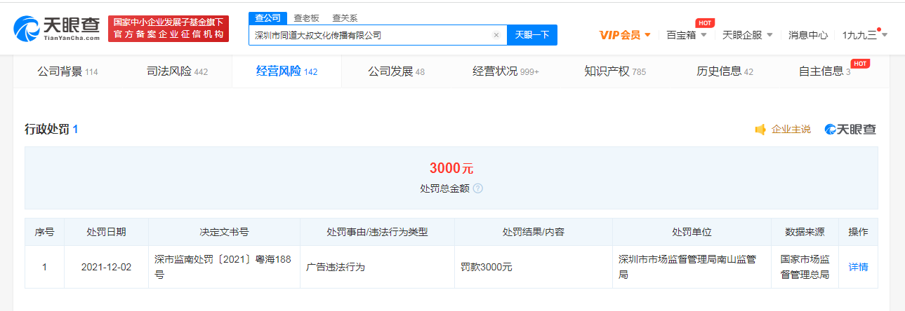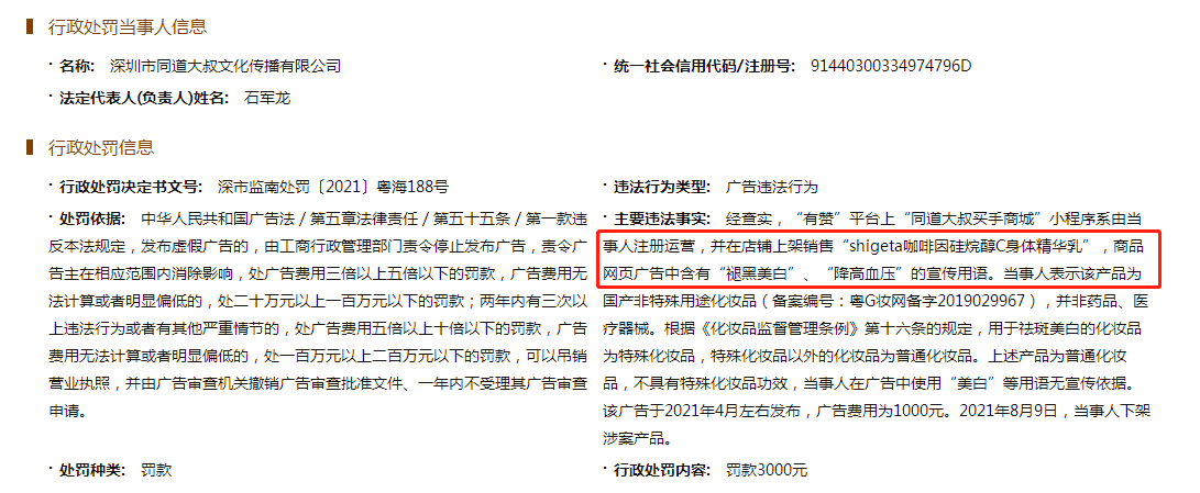 鞭牛士 12月10日消息,天眼查App显示,近日,深圳市同道大叔文化传播有限公司因广告违法行为被罚3000元,具体处罚事由为“同道大叔买手商城”小程序销售的某款身体精华乳,商品网页广告中含有“褪黑美白”、“降高血压”的宣传用语。