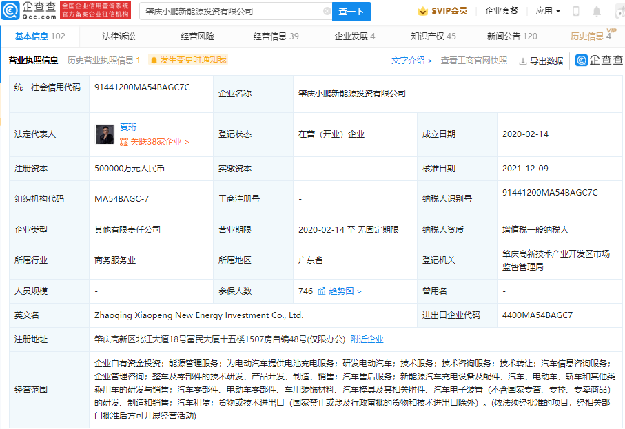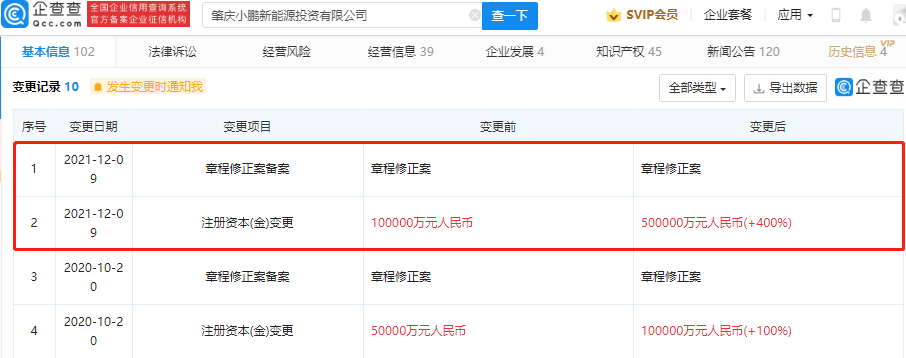 鞭牛士 12月10日消息,企查查APP显示,12月9日,肇庆小鹏新能源投资有限公司发生工商变更,公司注册资本由10亿元人民币增加至50亿元人民币,增幅达400%。