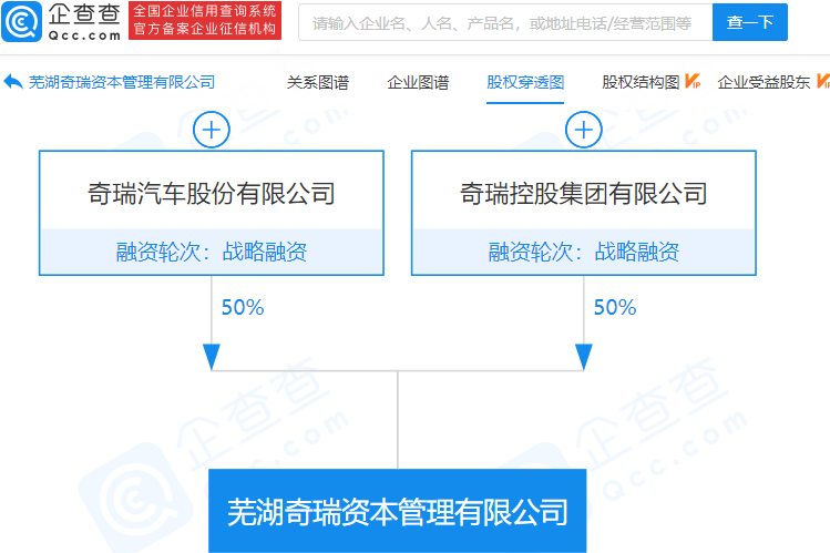 企查查股权穿透显示,该公司由奇瑞汽车股份有限公司、奇瑞控股集团有限公司共同持股。