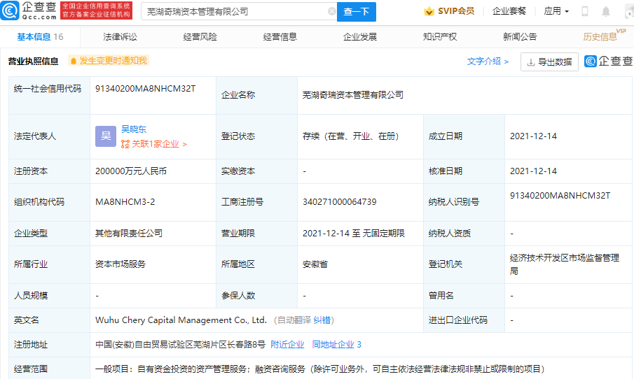 鞭牛士 12月16日消息,企查查APP显示,12月14日,芜湖奇瑞资本管理有限公司成立,法定代表人为吴晓东,注册资本20亿元人民币,经营范围包含:自有资金投资的资产管理服务;融资咨询服务。