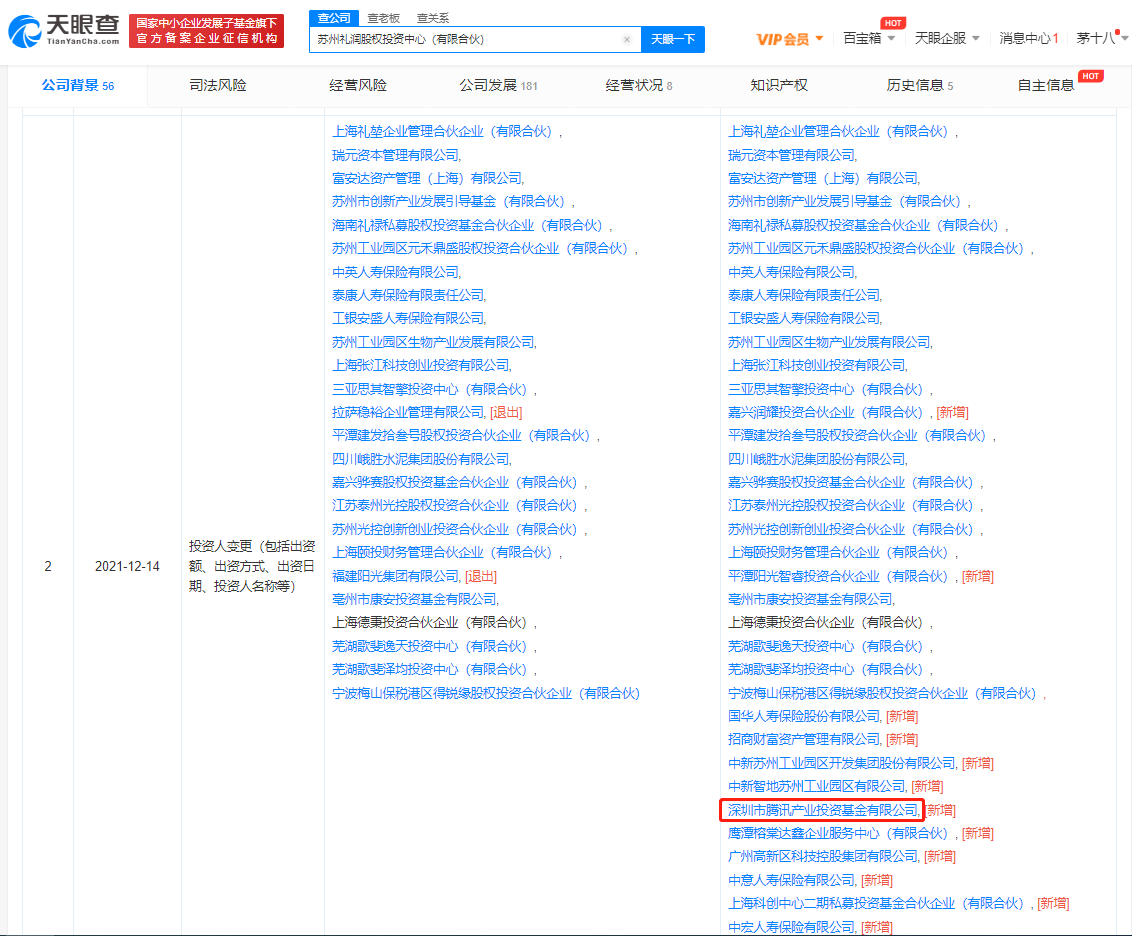 鞭牛士 12月16日消息,天眼查App显示,12月14日,苏州礼润股权投资中心(有限合伙)新增合伙人深圳市腾讯产业投资基金有限公司、招商财富资产管理有限公司等。