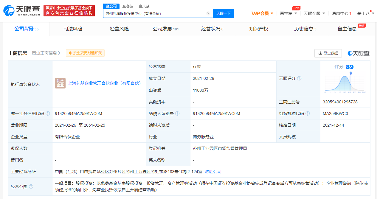 苏州礼润股权投资中心(有限合伙)成立于2021年2月,执行事务合伙人为上海礼堃企业管理合伙企业(有限合伙),经营范围包括企业管理咨询;以私募基金从事股权投资、投资管理、资产管理等活动。