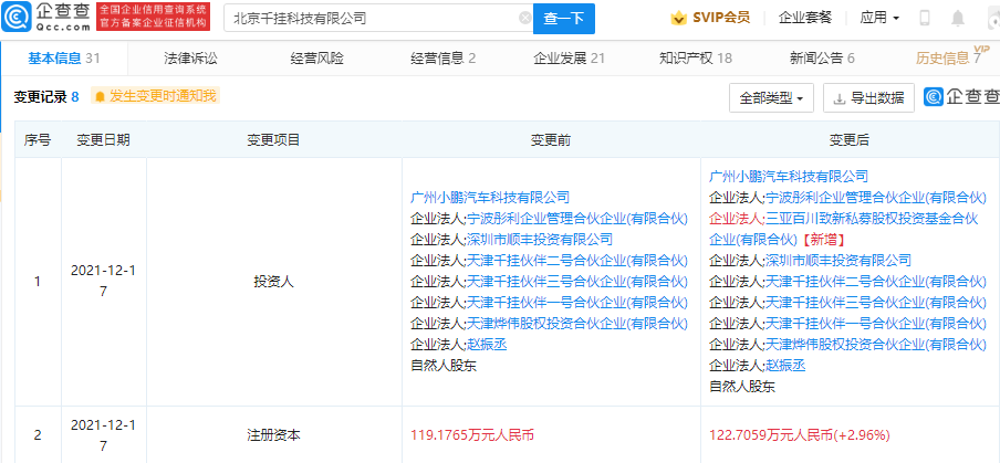 鞭牛士 12月20日消息,企查查APP显示,12月17日,北京千挂科技有限公司发生工商变更,新增百度关联公司三亚百川致新私募股权投资基金合伙企业(有限合伙)为股东,同时公司注册资本由119.18万元人民币增加至122.71万元人民币,增幅为2.96%。