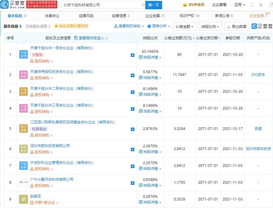 百度投资千挂科技,后者股东含小鹏汽车及顺丰