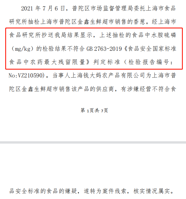 鞭牛士 12月20日消息,天眼查App显示,近日,因香葱抽检水胺硫磷不符合《食品安全国家标准食品中农药最大残留限量》判定标准,上海钱大妈农产品有限公司被上海市嘉定区市场监督管理局罚款2万,没收违法所得1.96元。