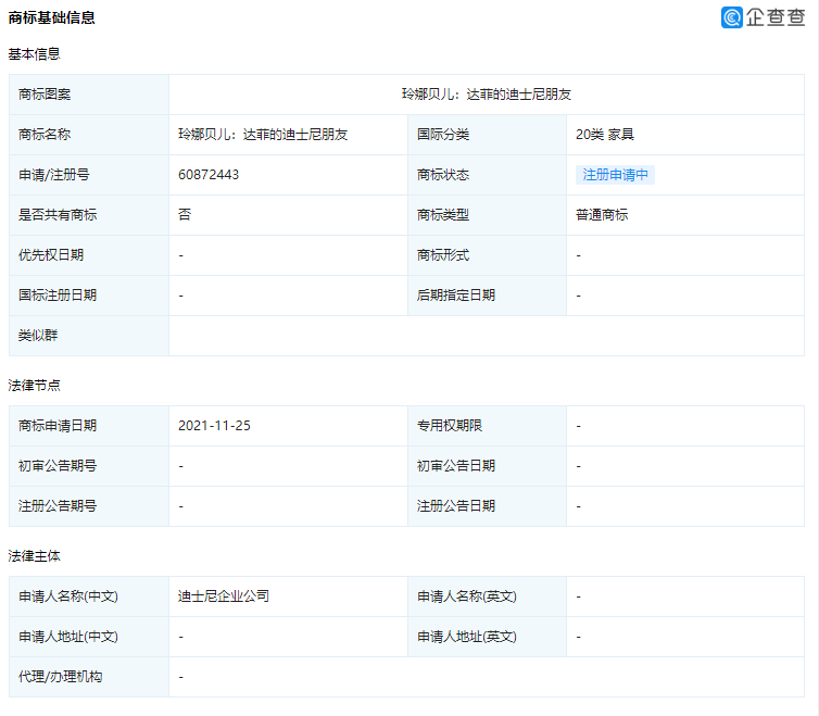 鞭牛士 12月20日消息,企查查App显示,近日,迪士尼企业公司申请注册玲娜贝儿:达菲的迪士尼朋友商标,商标国际分类涉家具、服装鞋帽等,目前商标状态为注册申请中,企查查显示,此前玲娜贝儿商标曾遭到多方抢注。