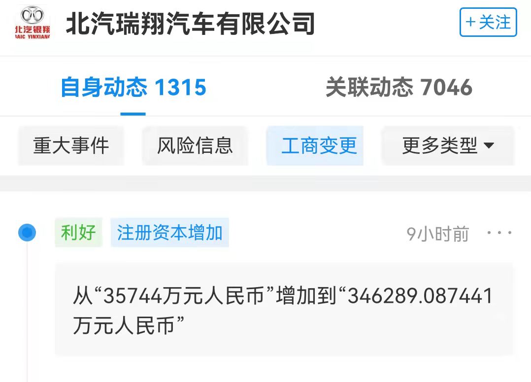 鞭牛士 12月28日消息,企查查APP显示,近日,北汽瑞翔汽车有限公司发生工商变更,公司注册资本由3.57亿元人民币增加至34.63亿元人民币,增幅达868.8%。