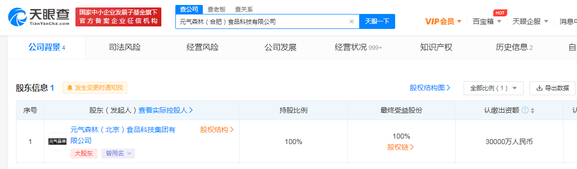 股东信息显示,该公司由元气森林(北京)食品科技集团有限公司全资持股。