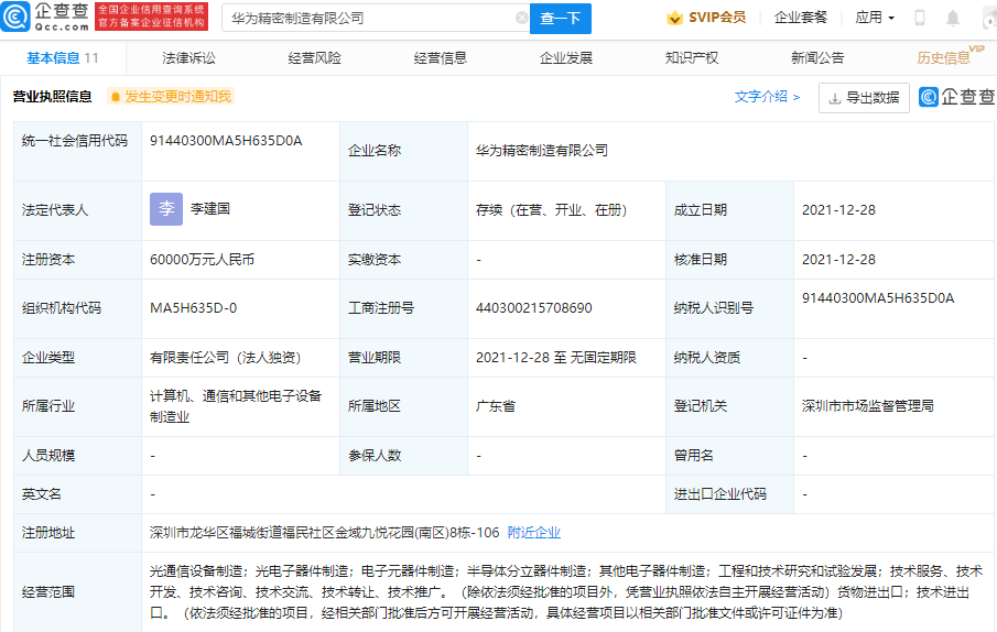 鞭牛士 12月28日消息,企查查APP显示,12月28日,华为精密制造有限公司成立,法定代表人为李建国,注册资本6亿元人民币,经营范围包含:光通信设备制造;光电子器件制造;电子元器件制造;半导体分立器件制造等。