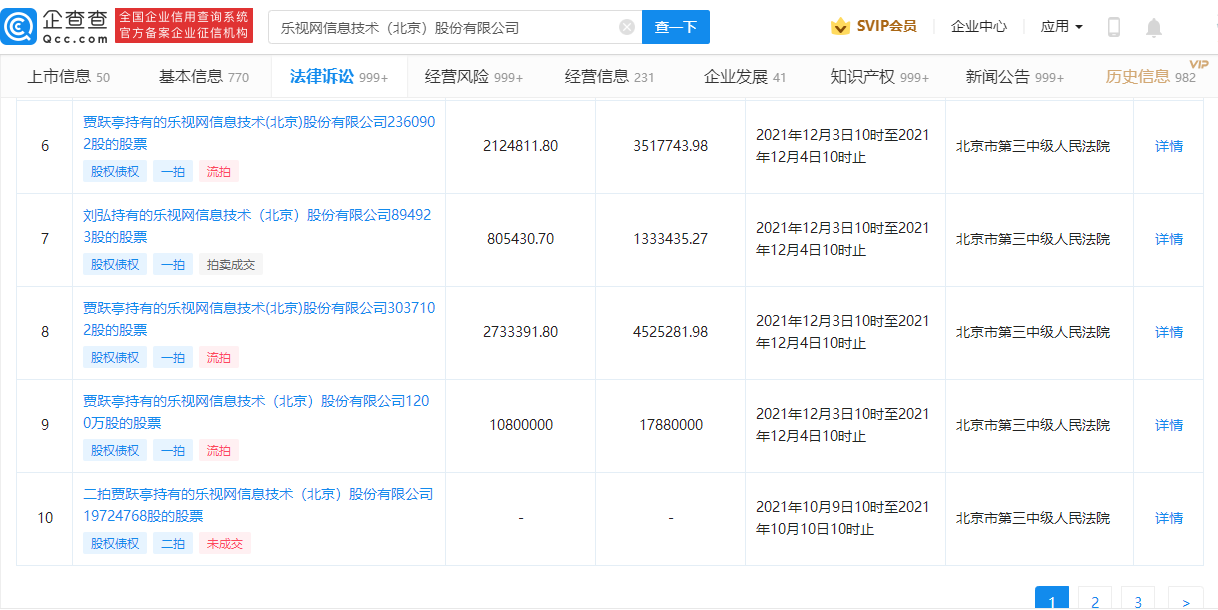 企查查APP显示,贾跃亭持有的乐视网股票此前已遭多次拍卖。