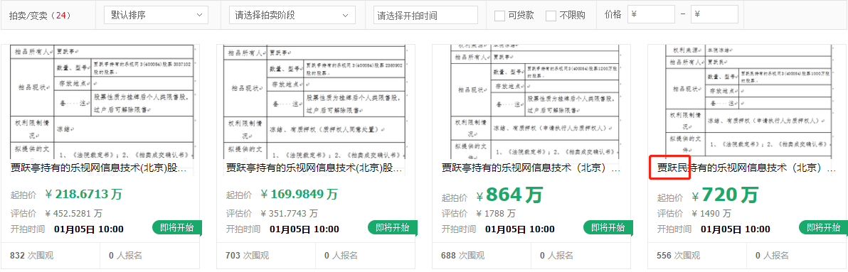 鞭牛士 12月28日消息,阿里拍卖显示,贾跃亭持有的共计1739.8万股乐视网股票将于2022年1月5日在阿里拍卖平台进行网络拍卖,起拍价1252.65万元。值得注意的是,拍卖页面显示,上述股权的评估价达2592.29万元,因此,起拍价较评估价折价达50%。另外, 贾跃民持有的乐视网信息技术(北京)股份有限公司1000万股的股票也将被拍卖,起拍价720万元。本次拍卖会已开启报名,有多人围观,但至今却是无人报名,很有可能出现流拍。