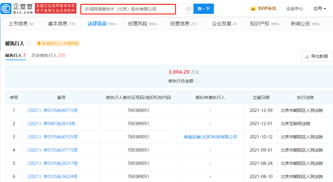 不过,企查查APP显示,目前乐视网信息技术(北京)股份有限公司仍有被执行人、失信信息、限制高消费信息,被执行总金额为3094.29 万元。