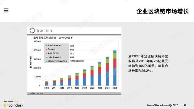 Bianews 4月3日消息,日前美国区块链媒体CoinDesk发布了“全球区块链现状报告”,报告预计,到2025年企业区块链年营收将从2016年的25亿美元增加到199亿美元,年复合增长率为26.2%。