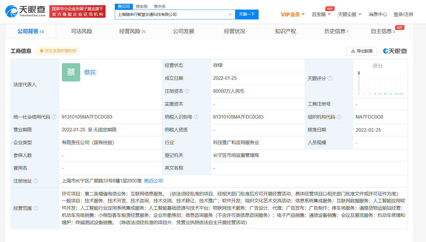 鞭牛士 1月26日消息,昨日,上海随申行智慧交通科技有限公司成立,法定代表人为蔡宾,注册资本8亿人民币,经营范围包括互联网信息服务;电子产品销售;机动车修理和维护;终端测试设备销售等。