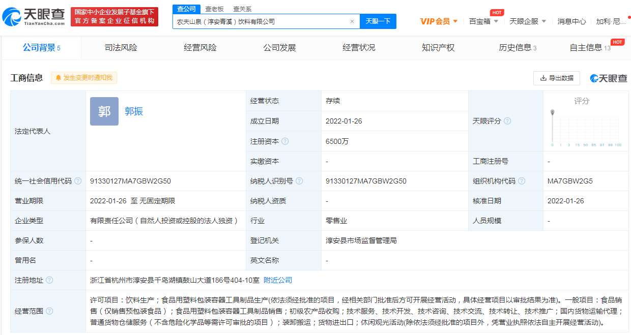 农夫山泉在千岛湖成立饮料新公司,注册资本6500万
