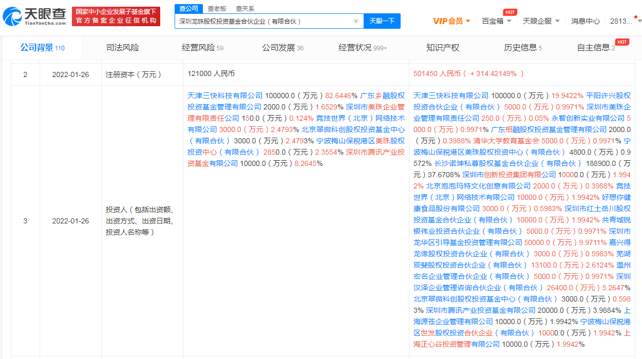 鞭牛士 1月27日消息,近日,深圳龙珠股权投资基金合伙企业(有限合伙)发生工商变更,合伙人新增北京泡泡玛特文化创意有限公司、好想你健康食品股份有限公司等,同时企业出资额由12.1亿人民币增至约50.15亿人民币。
