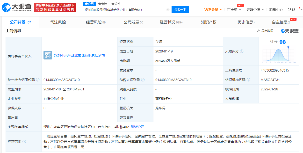 该企业成立于2020年1月,执行事务合伙人为深圳市美珠企业管理有限责任公司,经营范围含投资管理、股权投资等。