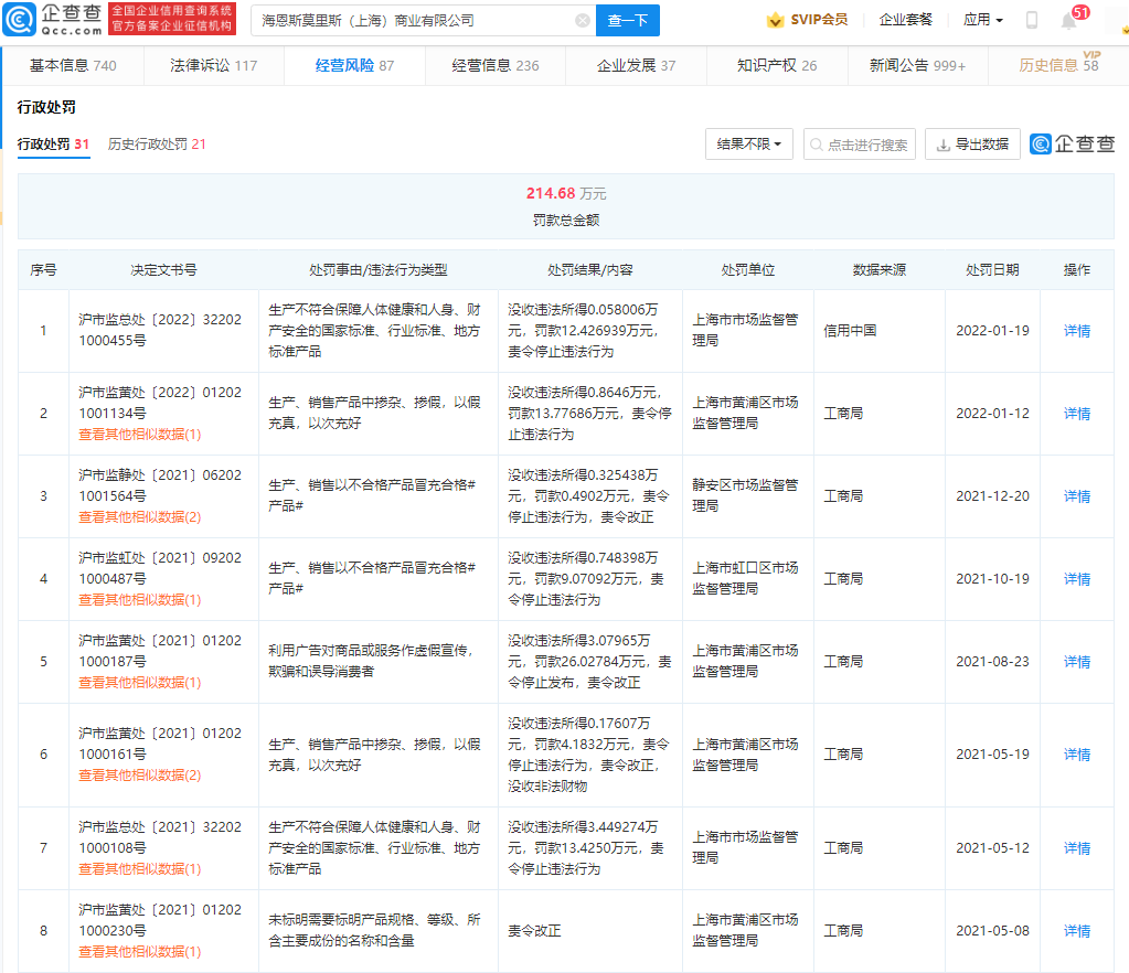 企查查显示,据本次处罚一周前,HM曾因以次充好被罚13.77万元。目前该公司累计行政处罚31次,处罚事由多为销售不合格产品、以次充好、以假充真。