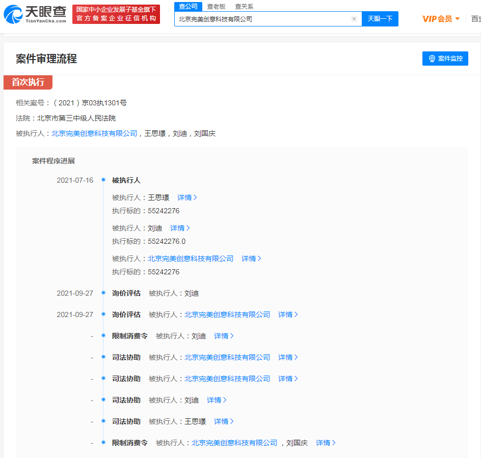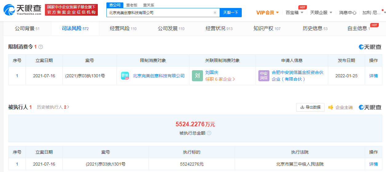 鞭牛士 1月29日消息,近日,北京完美创意科技有限公司新增限制消费令,关联限制消费对象为该公司董事长刘国庆、创始人兼CEO刘迪、董事王思璟。