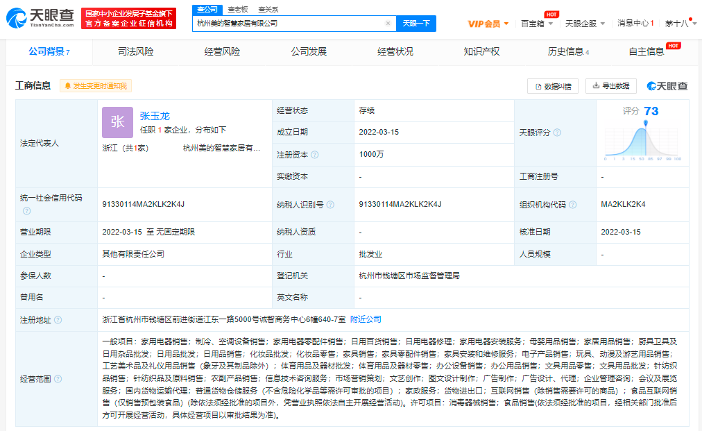 鞭牛士 3月17日消息,近日,杭州美的智慧家居有限公司成立,法定代表人张玉龙,注册资本1000万人民币,经营范围含家用电器销售;制冷、空调设备销售等。