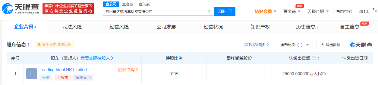 鞭牛士 4月20日消息,天眼查App显示,近日,杭州车之杭汽车科技有限公司成立,法定代表人为李想,注册资本2.5亿人民币,经营范围含新能源汽车整车销售;电动汽车充电基础设施运营;储能技术服务;充电桩销售等。股东信息显示,该公司由Leading Ideal HK Limited全资持股。