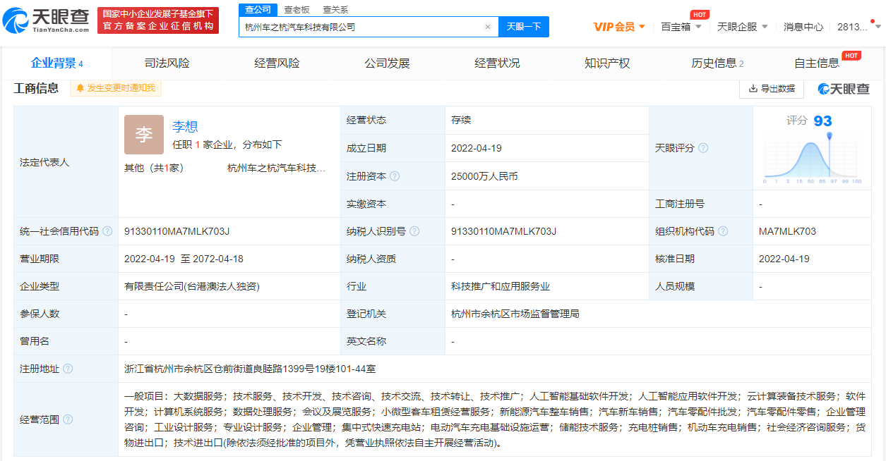 理想汽车成立车之杭汽车科技公司,注册资本2.5亿