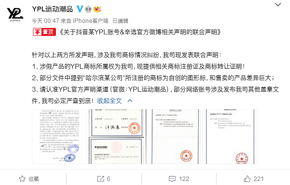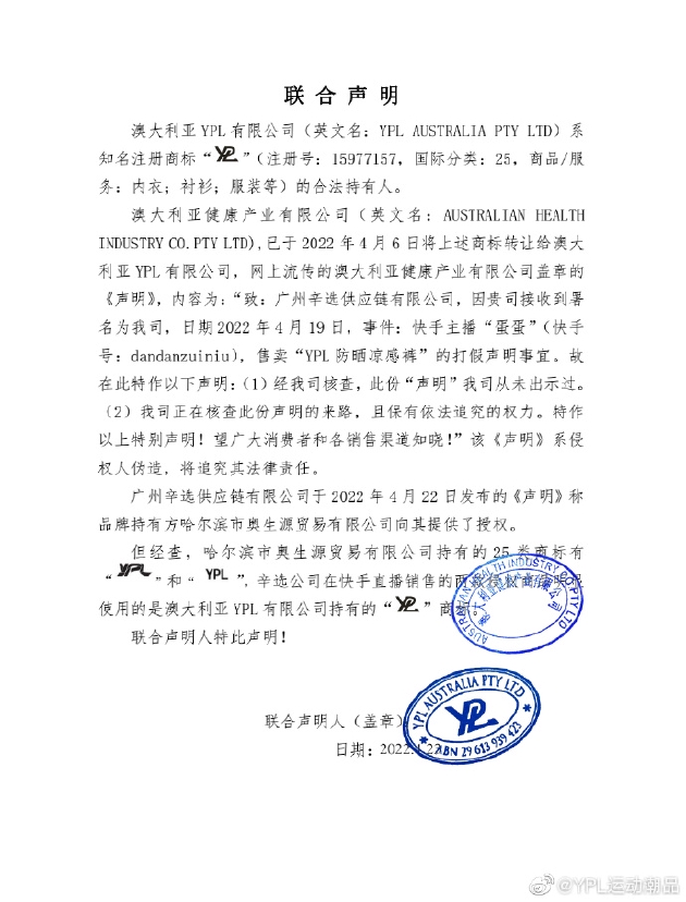 鞭牛士 4月23日消息,今日凌晨,质疑辛巴售卖假货瑜伽裤的“YPL运动潮品”再度发布声明称,“涉假产品的YPL商标所属权为我司,部分文件中提到“哈尔滨某公司”所注册的商标为自创的图形标,和售卖的产品差异巨大。部分网络账号涉及发布我司其他盖章文件,我司必定严查到底!”