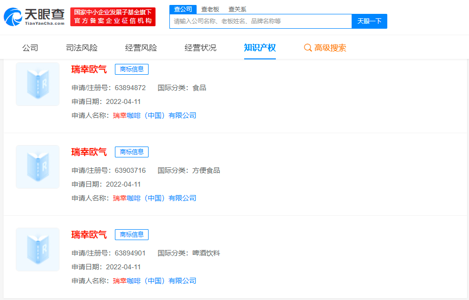 鞭牛士 4月24日消息,近日,瑞幸咖啡(中国)有限公司申请注册多项“瑞幸欧气”商标,国际分类涉及啤酒饮料、方便食品、食品,当前商标状态均为等待实质审查。据悉,欧气为网络用语,代指财气或运气。