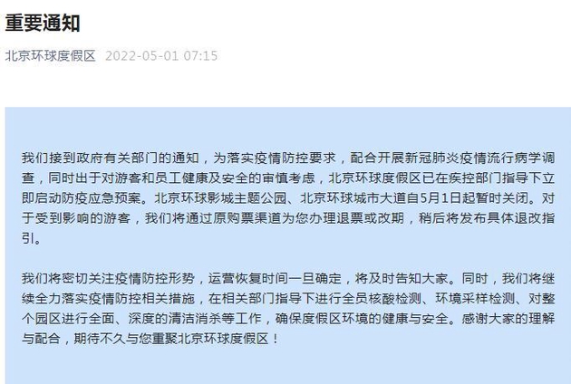 北京环球影城主题公园、北京环球城市大道自5月1日起暂时关闭。对于受到影响的游客,将通过原购票渠道办理退票或改期,稍后将发布具体退改指引。
