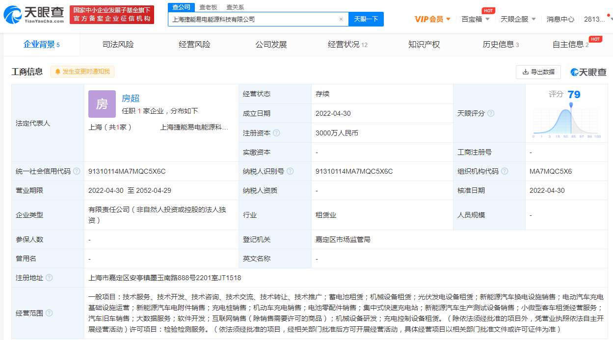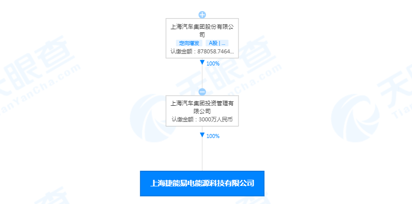 鞭牛士 5月6日消息,天眼查App显示,近日,上海捷能易电能源科技有限公司成立,法定代表人为房超,注册资本3000万人民币,经营范围含新能源汽车换电设施销售;电动汽车充电基础设施运营;充电桩销售等。股权穿透图显示,该公司由上海汽车集团股份有限公司间接全资持股。