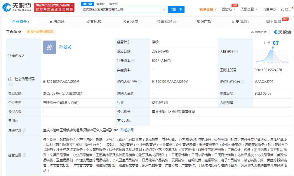 鞭牛士 5月7日消息,天眼查App显示,近日,重庆茶悦你我餐饮管理有限公司成立,法定代表人为孙翠英,注册资本500万人民币。
