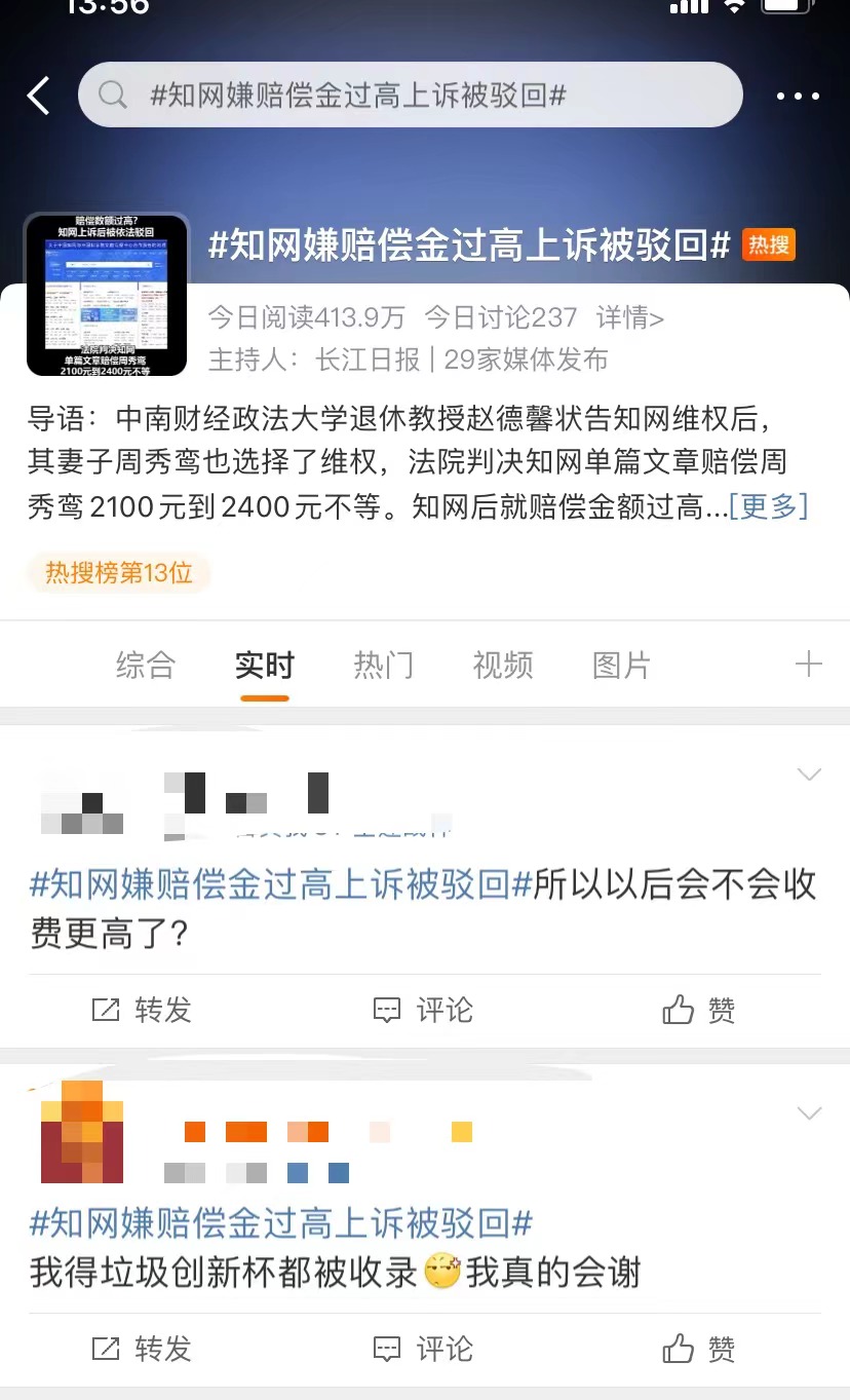 “知网嫌赔偿金过高上诉被驳回”上热搜,网友:以后会不会收费更高了?