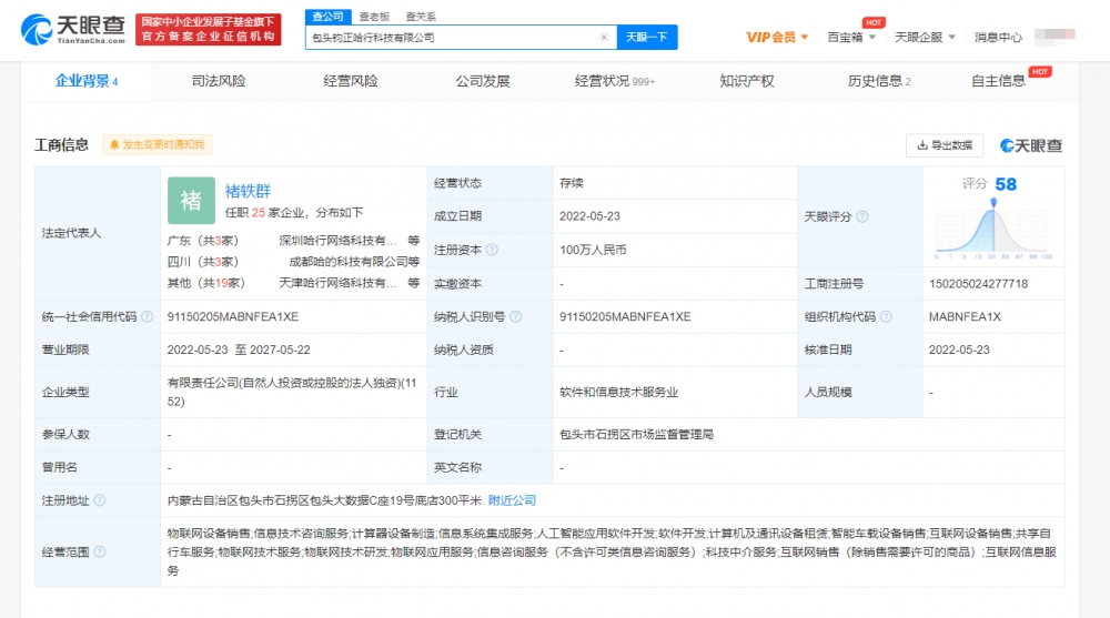 鞭牛士 5月25日消息,天眼查App显示,近日,包头钧正哈行科技有限公司成立,法定代表人褚轶群,注册资本100万人民币。