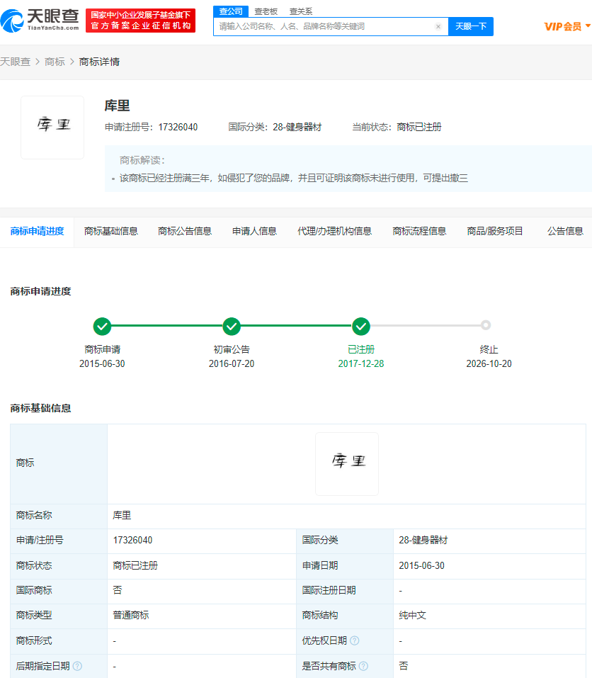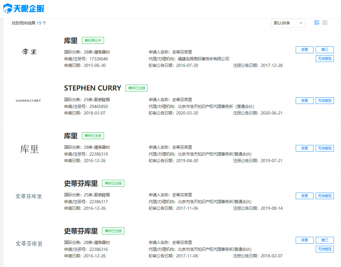 值得一提的是,上述最早申请的一枚健身器材类“库里”商标申请于2015年6月30日,疑似由福州某公司抢注,该商标申请前几天库里刚刚赢得其首个总冠军。最终,这枚商标经商标异议、商标转让后,申请人变更为库里本人。此外,库里申请注册的服装鞋帽类“史蒂芬库里”商标,曾被人提出异议,不过最终于2019年8月成功注册。