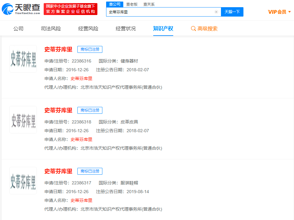 天眼查App显示,目前,库里本人申请注册“STEPHEN CURRY”“CURRY”“库里”“史蒂芬库里”商标共19枚,国际分类涉及健身器材、服装鞋帽、皮革皮具,除服装鞋帽类“库里”商标被驳回处于无效状态外,其余18枚商标已注册成功。