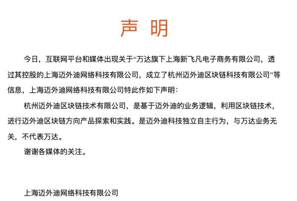 上海迈外迪声明称,杭州迈外迪区块链技术有限公司,是基于迈外迪的业务逻辑,利用区块链技术,进行迈外迪区块链向产品探索和实践,是迈外迪科技自主行为,与万达业务无关,不代表万达。