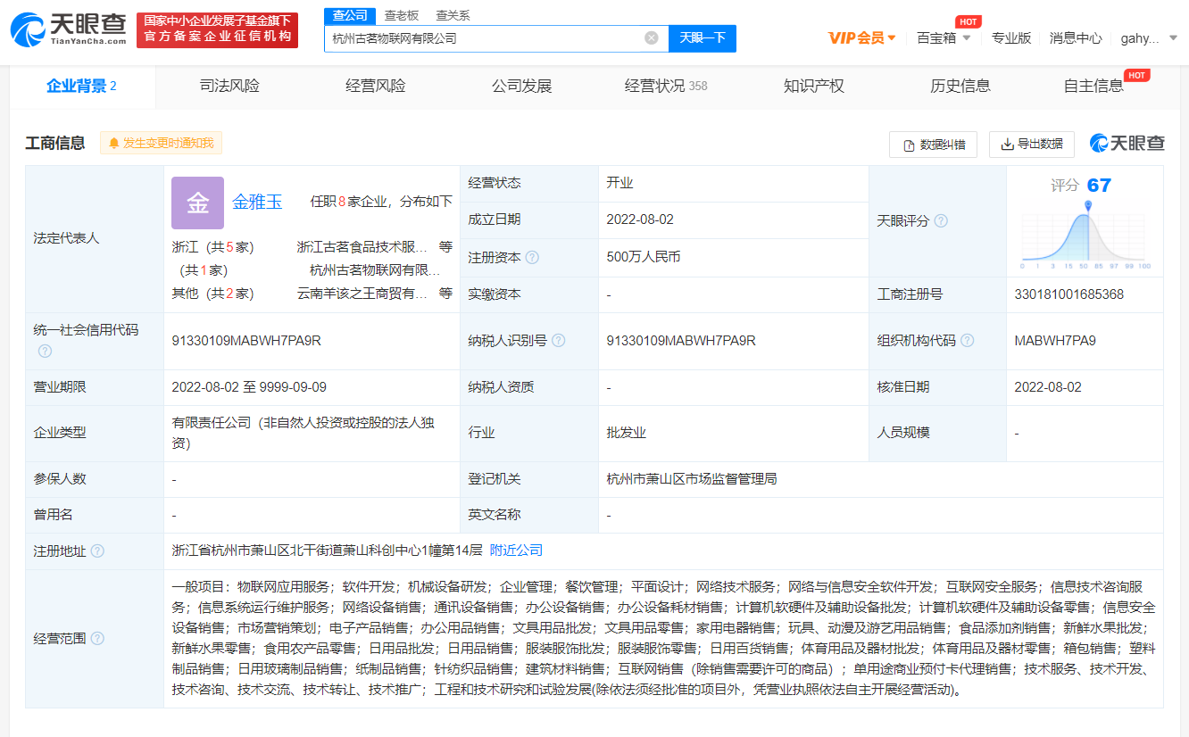 鞭牛士 8月10日消息,天眼查App显示,近日,杭州古茗物联网有限公司成立,法定代表人为金雅玉,注册资本500万人民币,经营范围包括物联网应用服务;机械设备研发;餐饮管理;网络与信息安全软件开发;工程和技术研究和试验发展等。
